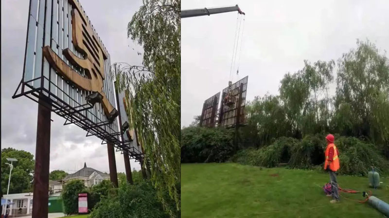 近日,九亭城管中隊(duì)對(duì)夏州花園小區(qū)和九洲大唐花園小區(qū)出入口的大型戶外廣告牌依法進(jìn)行了拆除?!斑@塊廣告牌靠近大門口,銹蝕又松動(dòng),存在較大的安全隱患?!本磐こ枪苤嘘?duì)執(zhí)法人員告訴小松,該處廣告設(shè)施由小區(qū)開(kāi)發(fā)商設(shè)立,廣告牌長(zhǎng)約20米,高約9米,因長(zhǎng)期受到風(fēng)雨的影響,各個(gè)焊接部位有不同程度的破損、銹蝕,存在安全隱患。