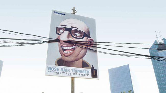 10、松下鼻毛修剪器的戶外廣告,巧妙利用高壓電線與鼻毛相似的結構特征,有趣地宣傳了該設備的滿足顧客修剪鼻毛的需求并展示了其切割的安全性。