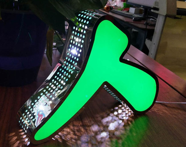 高邊發光字材料組成:鏡面不銹鋼圍邊(也叫光面)、亞克力發光面板、LED模組光源。