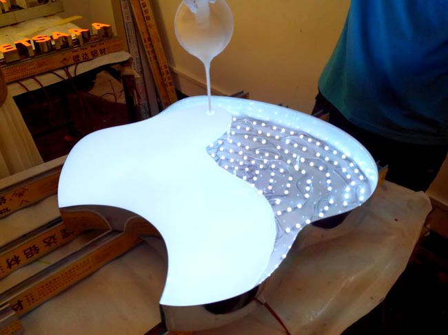 LED樹脂發光字是由外殼、填充原料、發光源三部分組成。是由調制好的樹脂倒入預先制好的模具里固化成型的,僅這個模具上,得考驗產品的外觀是不是美觀和標準。并且模具成本方面不能太高以及制作方便快速。固化后脫模修整裝燈了。